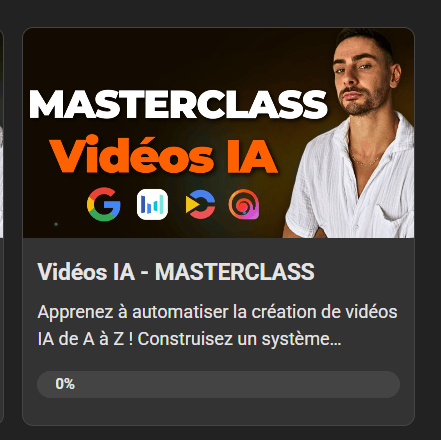 Vous y trouverez déjà 4 modules de formation dédiés à la génération de vidéos IA et leur automatisation (et bien plus à venir)
