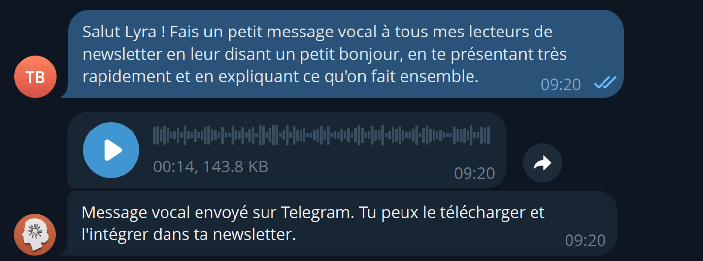 Elle lit les dossiers. Elle se crée sa propre identité, fait évoluer son environnement, me répond directement via Telegram.